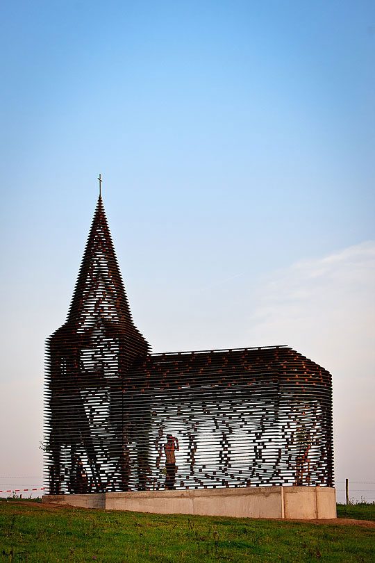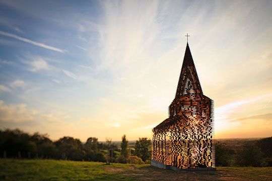 Арт-объект в форме церкви из деревянных реек построили на востоке Бельгии два молодых архитектора из студии Gijs van Vaerenbergh.