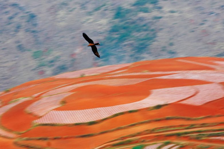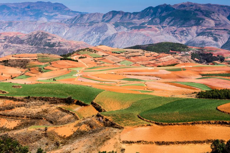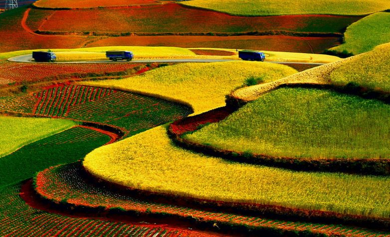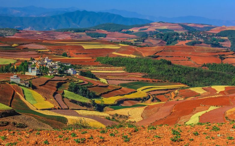 Десятки оттенков можно насчитать на причудливом узоре «Красных земель» Дончуаня, Китай. Разнообразие цветов объясняется наличием в ее составе примесей окислов железа и некоторых других металлов. Все остальное – сельскохозяйственные наделы, которые китайские земледельцы засевают рисом, картофелем, кукурузой, гречихой и другими культурами.