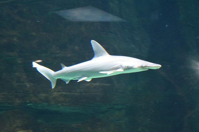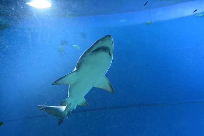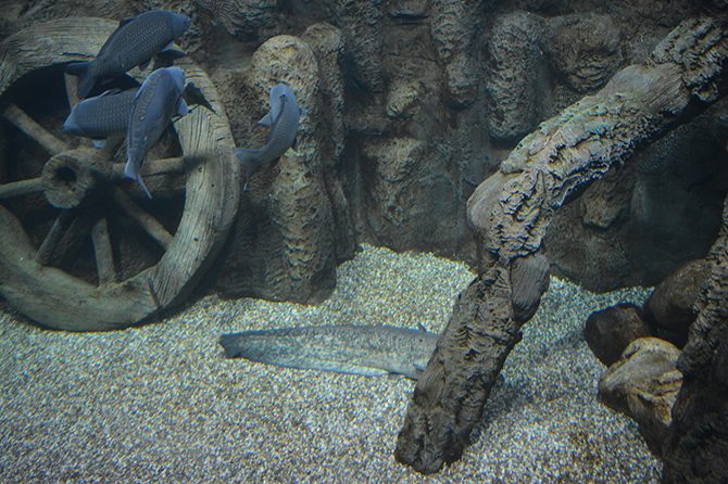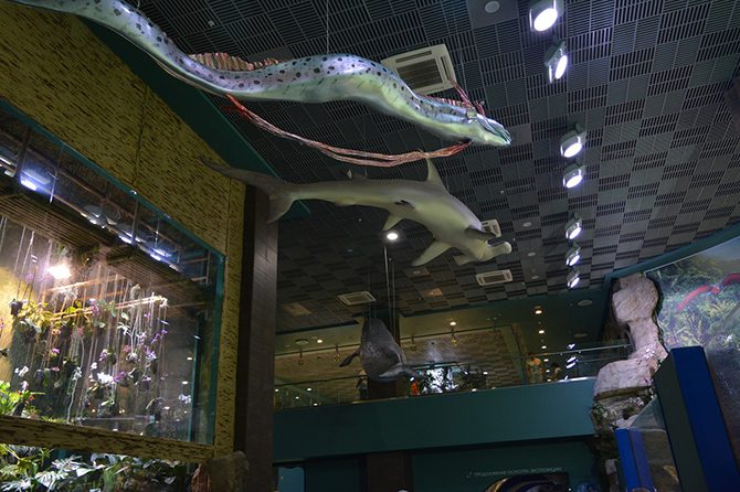 Вас сразу встречает аквариум с акулой и… Семейство скатов.