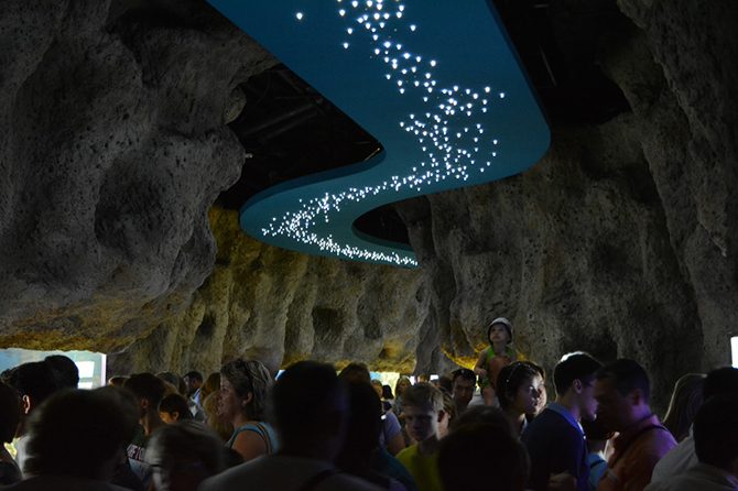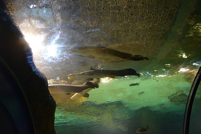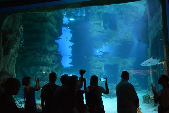 Полуарка на дне огромного аквариума. Народа больше чем рыб. И это 11 утра.