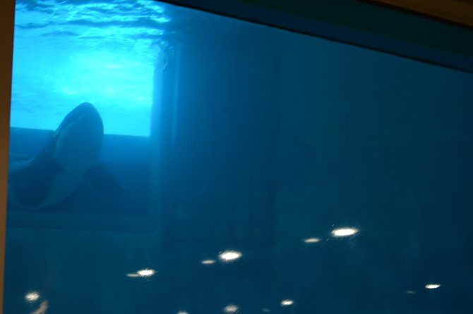 На втором этаже окно к касаткам. Там их 3 штуки, но им всё равно на людей…