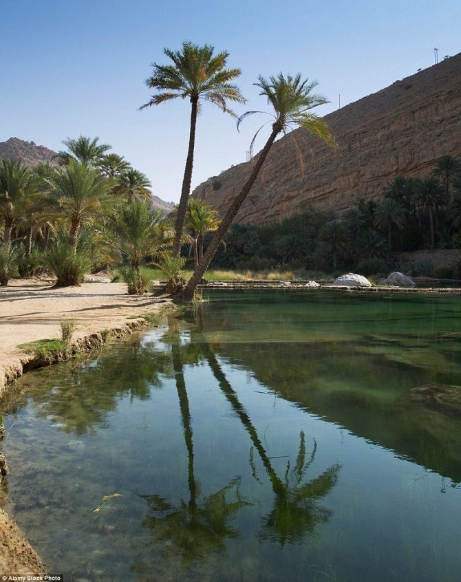 Водоём в долине Вади Шааб, которая лежит среди каньонов в пустыне в Омане. Вода приобретает зелёный оттенок благодаря минералам, которые содержатся в известняке.
