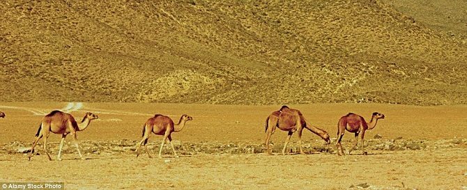 Верблюды бредут по пыльной пустыне. Оман имеет один из самых жарких климатов в мире.