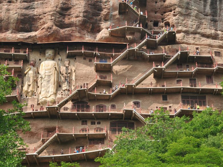 4. Майцзишань или «Пшеничная гора» — один из крупнейших буддийских пещерных монастырей Китая в форме муравейника 142-х метровой высоты. Начало монашеской жизни и строительства первых пещер относят к периоду династии Поздняя Цинь (384 — 417).