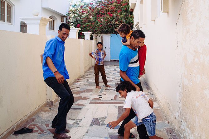 Соседи по квартире Араби и Хуссейн играют с детьми во дворе.