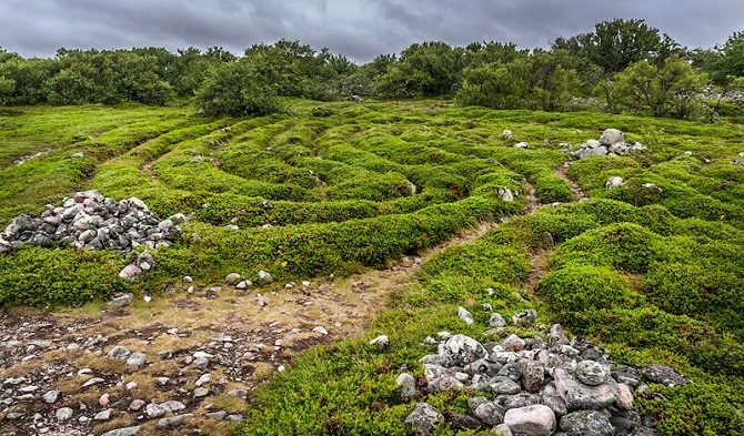 35 каменных сооружений, найденных на Соловецких островах, входят в группу так называемых «северных лабиринтов». Точно такие же постройки есть в Ирландии и Шотландии, что может говорить о существовании в прошлом единой нации, расселившейся по миру. Археологи связывают лабиринты с культом мертвых — здесь были найдены останки человеческих жертвоприношений. Местные жители стараются обходить лабиринты стороной.