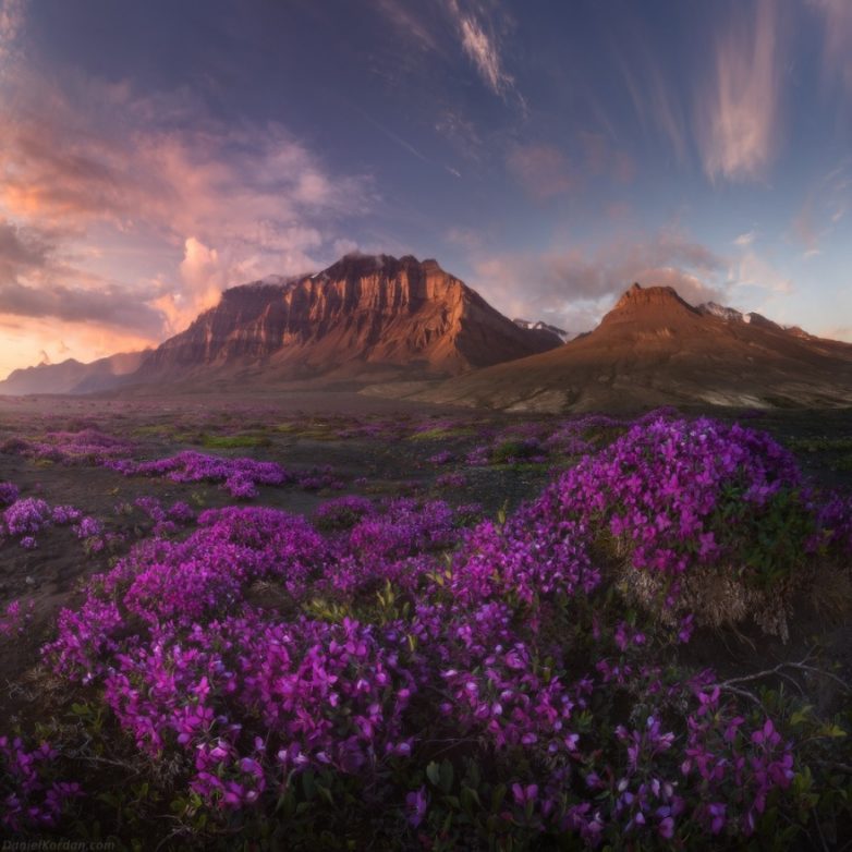 Даниил Коржонов по образованию физик, а по призванию художник. Фотограф придумывает и тестирует туристические маршруты в красивейших уголках мира. В этот раз в фокус его объектива попала Гренландия. Из-за своего географического положения остров практически полностью покрыт льдами, что дарит возможность фотографам делать просто фантастические снимки цветущих долин на фоне заснеженных вершин.