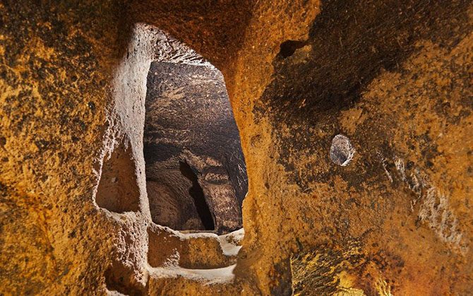 Расположенный в вымытом дождем бассейне в южной Каппадокии, этот обширный древний подземный город содержит множество комнат, прихожих, конюшни, церкви, виноградные прессы и прессы для отжима масла, дымоходы, для того чтобы поступал свежий воздух в подземелье. Здесь также находятся школы, комнаты для исследования, и даже могилы. Это целый подземный город.