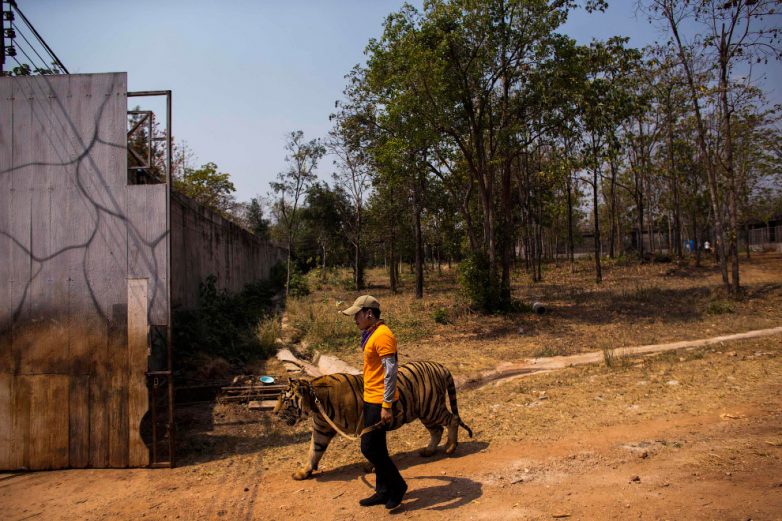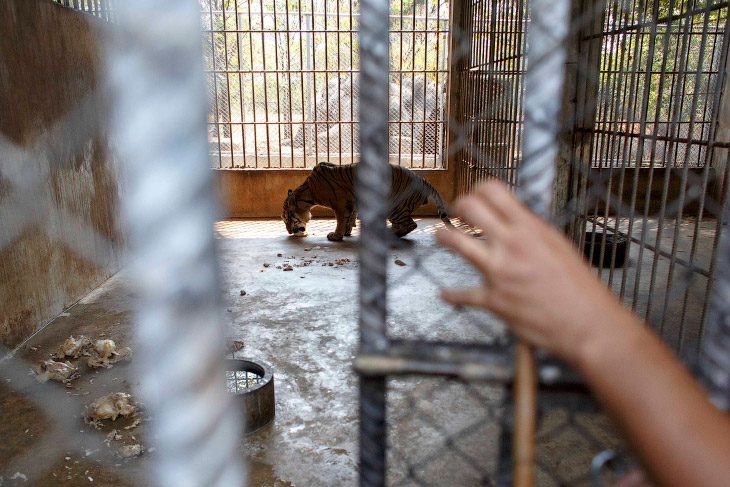 Часть времени большие и маленькие тигры находятся в клетках, которую приоткрывает волонтер.