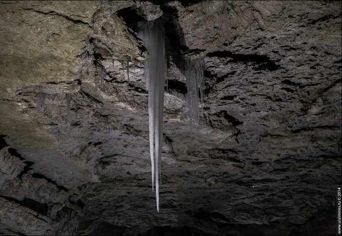 14. С кровли свисают ледяные сталактиты. На этом гроте проходит точка росы, поэтому дальше в пещере становится заметно теплее +5 °C.
