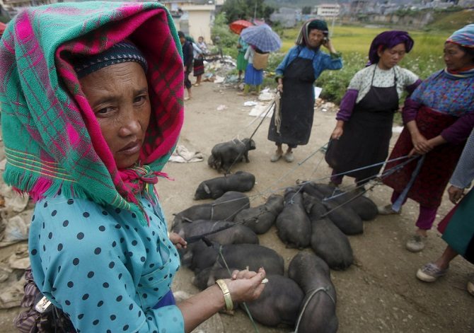 4. Местный рынок. Продажа поросят необычной для нас раскраски, Вьетнам, 20 сентября 2015.