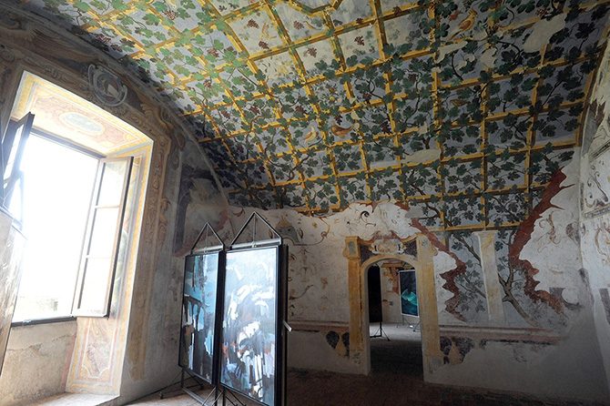 Многие залы замка расписаны фресками. В росписях присутствуют натуралистические, фантастические темы, гротескная живопись.