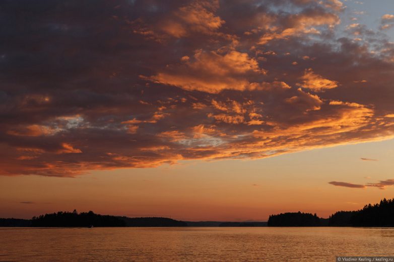 2. Пока мы отчаливаем, светило прячется за горизонтом. Облачный перфоманс невероятно драматичен. Такие пейзажи лучше всего созерцать под музыку Рихарда Вагнера. Но нам аккомпанируют лишь плеск воды, да рокот лодочного мотора.