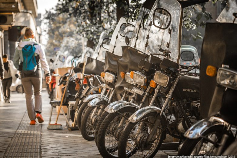 3. В Тегеране безумное количество мопедов, но при этом характер дорожного движения здесь очень сильно отличается от городов Юго-Восточной Азии. Хаос есть, но он какой-то другой. Не такой хаотичный, как в Таиланде или Вьетнаме. Мотопарк, как и автопарк, довольно старый и очень однообразный — вы можете выбрать в нашем магазине любой мопед, при условии, что это будет Honda черного цвета.