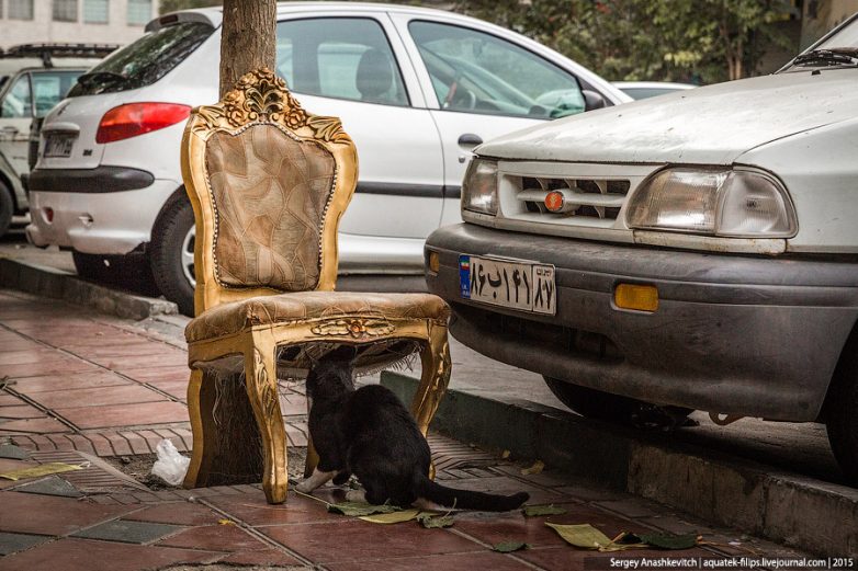 40. Часто на тегеранских улицах можно встретить странности и какие-то не совсем обычные вещи. Что делает под деревом этот резной стул, одному Аллаху известно, все-таки выбрасывать вещи вот так, не на мусорку, здесь не принято.