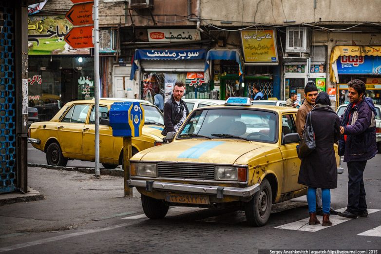 32. В Иране огромное количество такси. Машины часто очень старые. Таксисты, завидев иностранца, идущего по тротуару, тут же сигналят, предлагая подвезти. Услуги такси по городу стоят довольно дешево.