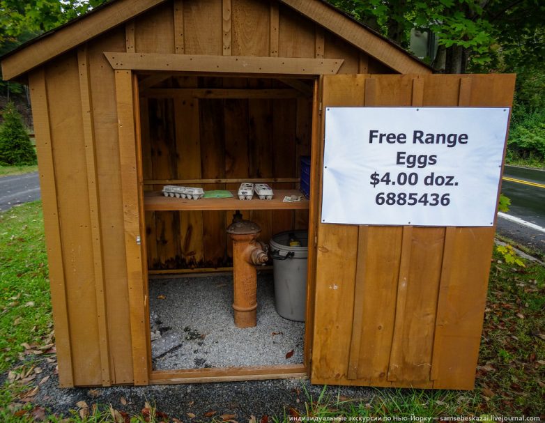 48. В домике на полке лежат контейнеры с яйцами и куча пустых — люди привозят из дома свои, чтобы фермерам не надо было тратиться на их закупку. Вы берете контейнер, а деньги кладете под камушек. Все. Яйца ваши. На момент покупки под камнем лежало 18 долларов. Я добавил к ним свои пять и взял сдачу один доллар.