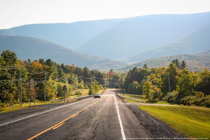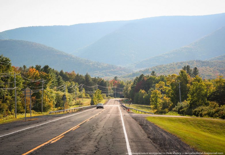 Так получилось, что осень этого года мы всей семьей провели не в Нью-Йорке, а в Катскильских горах, что находятся в двух часах езды от Манхэттена. 187 км от моста Джорджа Вашингтона, если оперировать не временем, а расстоянием. Надо пересечь Гудзон, выехать на 87 дорогу, включить круиз-контроль и долго ехать на север со скоростью 110 км/ч., пока местность не начнет меняться и на горизонте не покажутся предместья высоких гор. Потом надо съехать с хайвея, свернуть влево и начать медленный подъем вверх. Сначала он будет довольно пологим, но проехав через множество сонных деревенек дорога доберется до перевала и начнет извиваться меж горных вершин.
