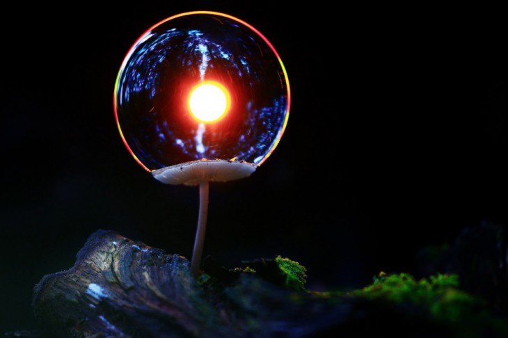 В кадре мыльный пузырь на шляпке гриба, контровая подсветка позволила получить такой интересный эффект.
