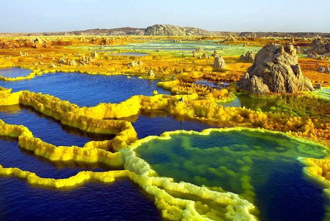 Неземные пейзажи озера, которое образовалось при сильном взрыве вулкана Далол.