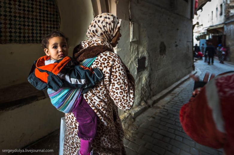 Детей крепят на спину на манер рюкзаков. Обратите внимание на платье молодой мамы – леопардовый сейчас настоящий тренд сезона в Марокко: