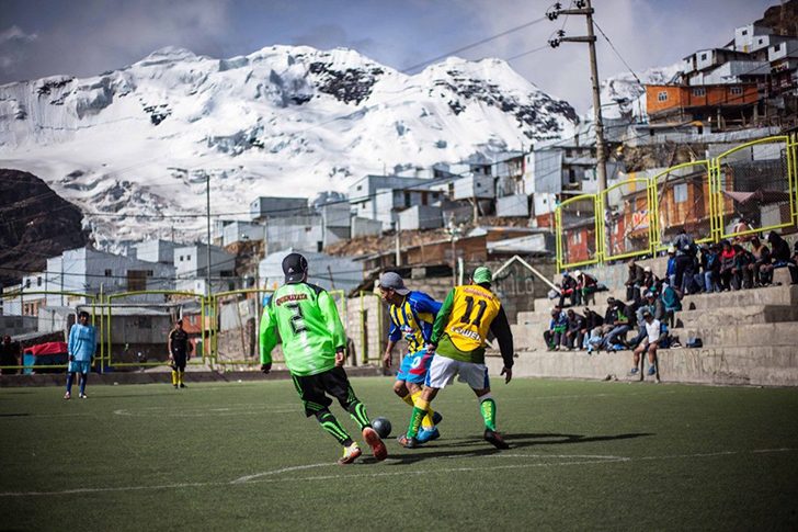 В свободное от работы время местные довольствуются традиционными развлечениями или встречаются в кафе, построенных для шахтеров. На этой фотографии молодежь играет в футбол на пятачке земли, расположенном недалеко от шахт.