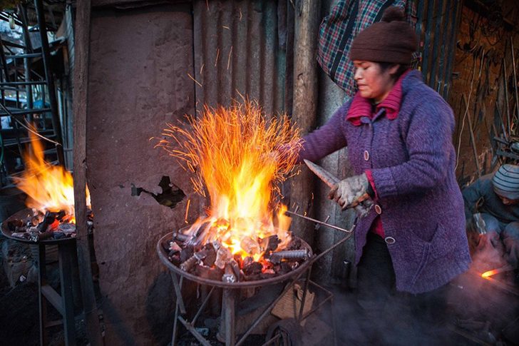 Женщинам запрещено входить в шахты, поэтому они трудятся снаружи. Эта женщина делает металлические детали, которые служат каркасом для тоннелей.