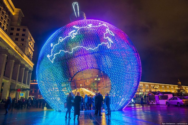 На шаре карта России. Сам шар переливается всеми цветами. Фактически — это большой светодиодный экран, на котором можно показывать что угодно.