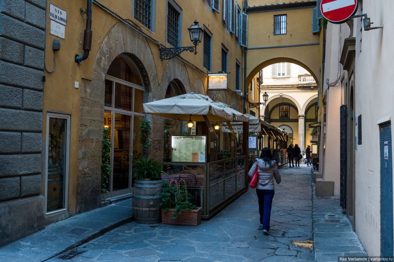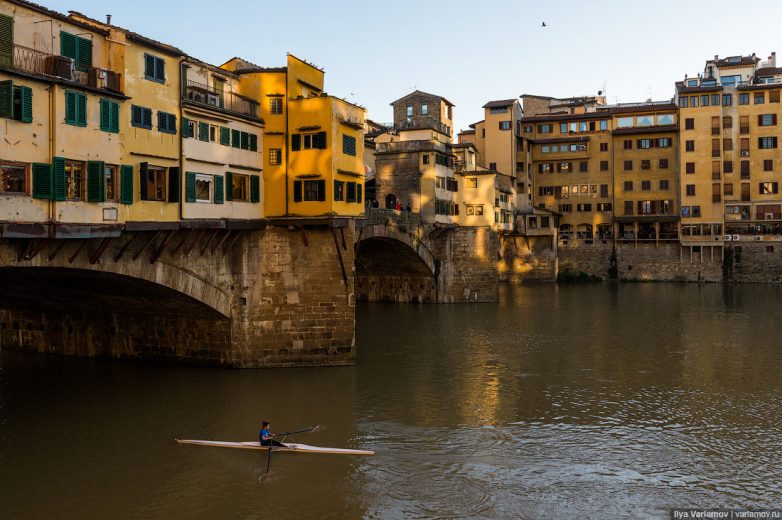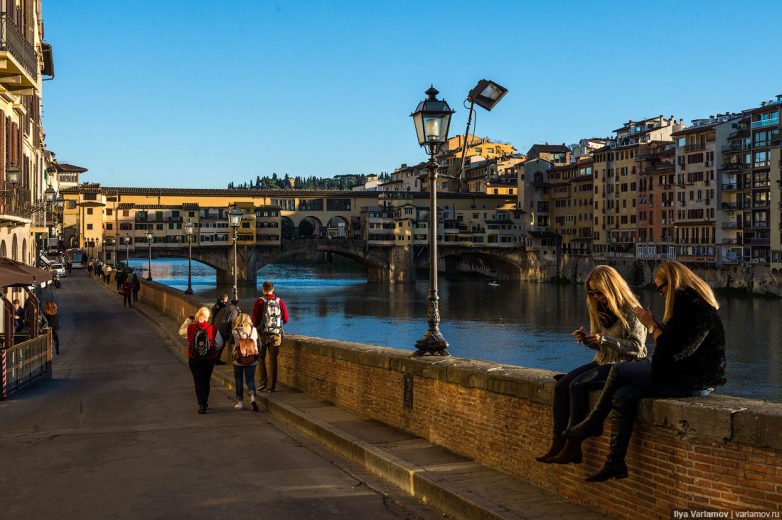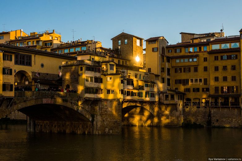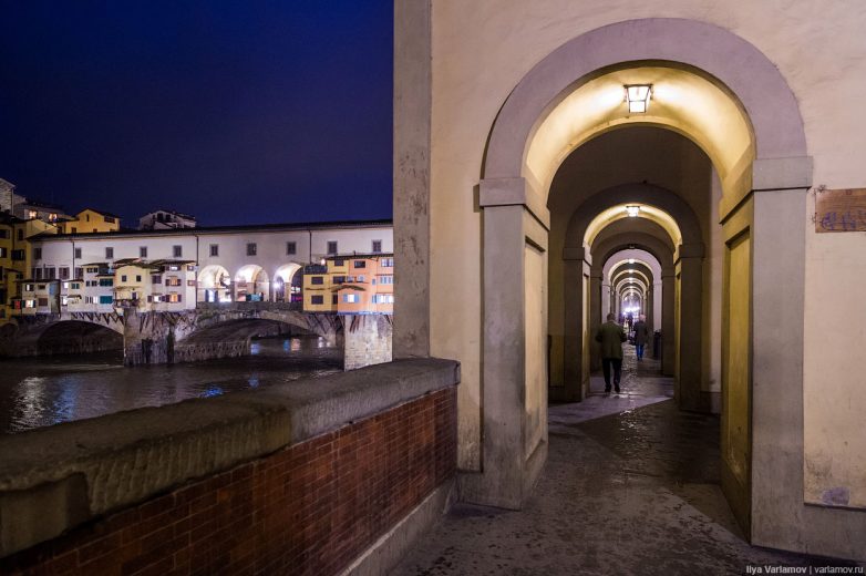 Другое его название – «Золотой мост» – появилось как раз из-за лавок ювелиров, обосновавшихся здесь в XVI веке. Историки пишут, что пока не пришли ювелиры, на мосту стояла жуткая вонь из-за тухлого мяса. По одной из версий, галерею надстроили специально для того, чтобы зловоние не мешало тосканскому герцогу Козимо I переходить из дворца во дворец.