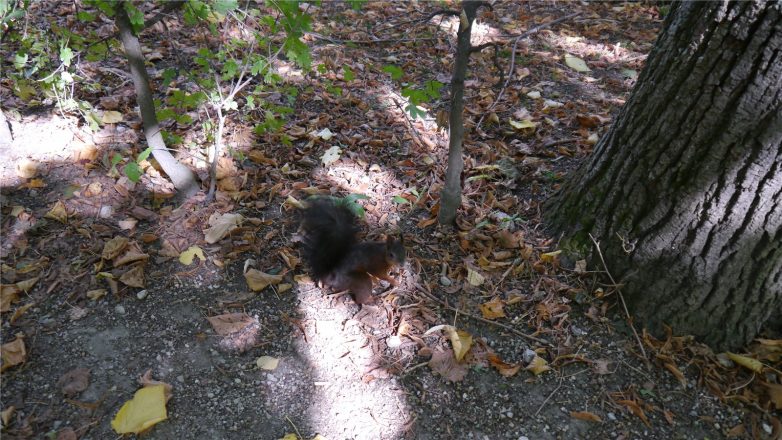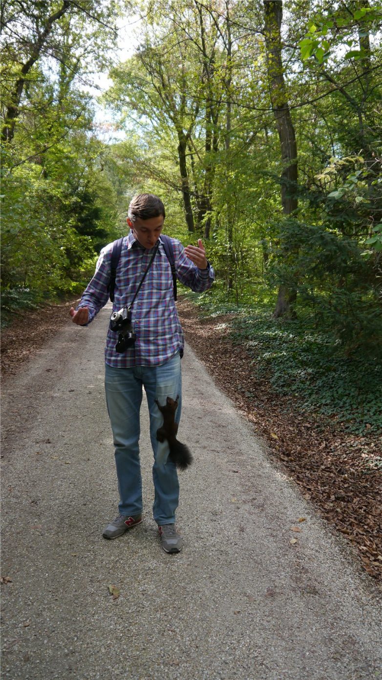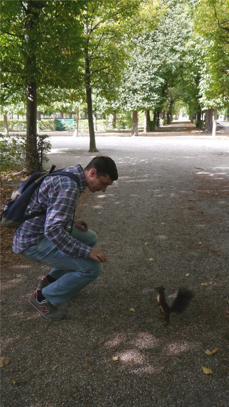 Мы запаслись орехами еще накануне, так как предполагали, что отправимся в Шёнбрунн скорее поиграть с белками, чем любоваться дворцом, но одно другому не мешает, а мы тем временем свернули в первую аллею парка и я принялся зазывать белок лакомством, опустившись на корточки. Мне не пришлось долго ждать и вот уже первая рыжая красавица несётся через кусты и запускает свой мохнатый нос в мою ладонь, не только к моей радости, но и к радости проходящих мимо отдыхающих.