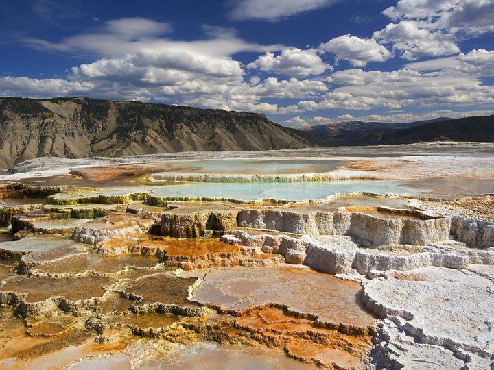 Травертиновые террасы — уникальное творение природы. По ним бежит обогащенная кальцием вода, которая испаряется и образует белоснежные отложения.