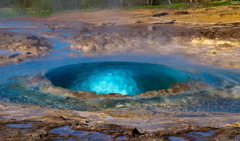 Слово «гейзер» произошло от исландского «geysa», что означает «хлынуть». Самый первый из задокументированных и известных миру гейзеров, Гейсир (Geysir) был открыт в 1294 году. Он дал название всем кипящим и фонтанирующим источникам мира. Как и большинство гейзеров Исландии, Гейсир находится в юго-восточной части острова, в долине Хаукадалур (Haukadalur), что буквально означает «сад горячих источников». К сожалению, легендарный Гейсир утратил свою активность в результате землетрясения 2000 года. Но ему на смену пришел Строккур (Strokkur). Он извергается каждые 5-10 минут, выбрасывая струю горячей воды на высоту до 20 метров. Благодаря своей неугомонности он считается одним из самых активных гейзеров в мире.Начало извержения гейзера Строккур: