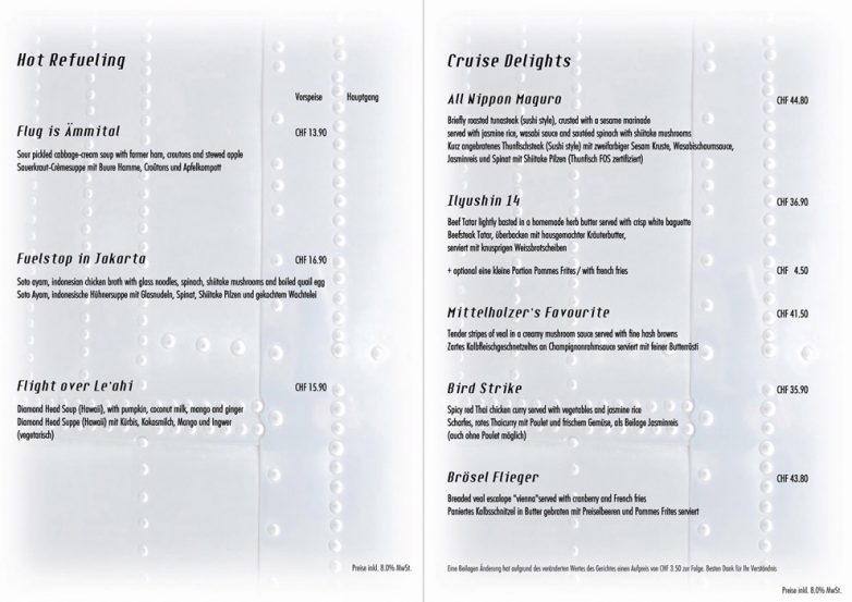 Прошли внутрь и заняли столик с настоящими самолетными креслами, из подлокотников которых вынимается еще один столик — за которым едят в самолете пассажиры первого ряда бизнес-класса или те, кто сидит у аварийного выхода. Меню сделано в виде куска закрылка, а еду развозят на тех самых узких самолетных тележках, которые проходят между рядами.