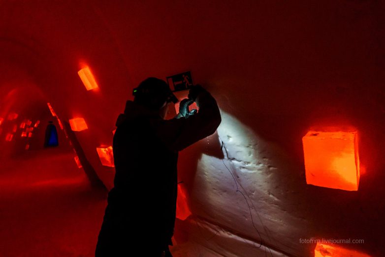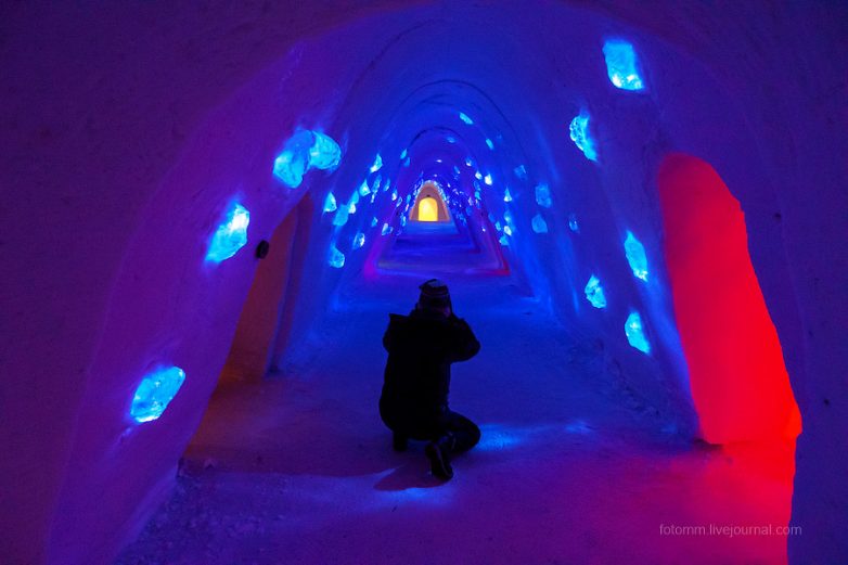 Снежные стены коридоров инкрустированы огромными ледяными кристаллами, подсвеченными изнутри.