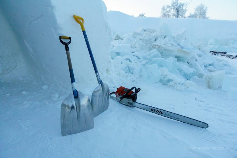 Обычные лопаты и бензопила — пожалуй, основные инструменты. Рядом — куча бесформенного льда, которая через некоторое время превратится в произведения искусства.