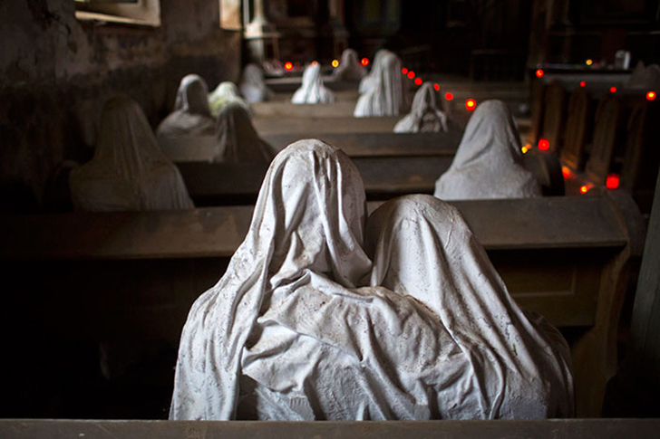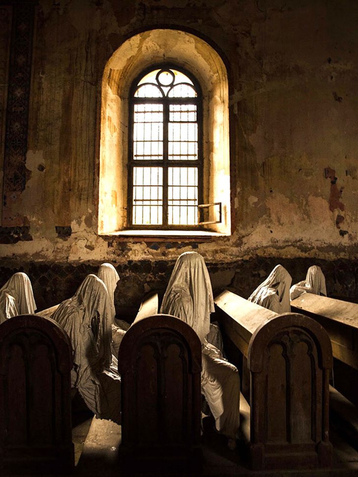 В попытке привлечь внимание к старому историческому зданию местный художник Якуб Хадрава превратил развалины в арт-объект. Теперь на скамьях для прихожан сидят безмолвные неподвижные белые силуэты.