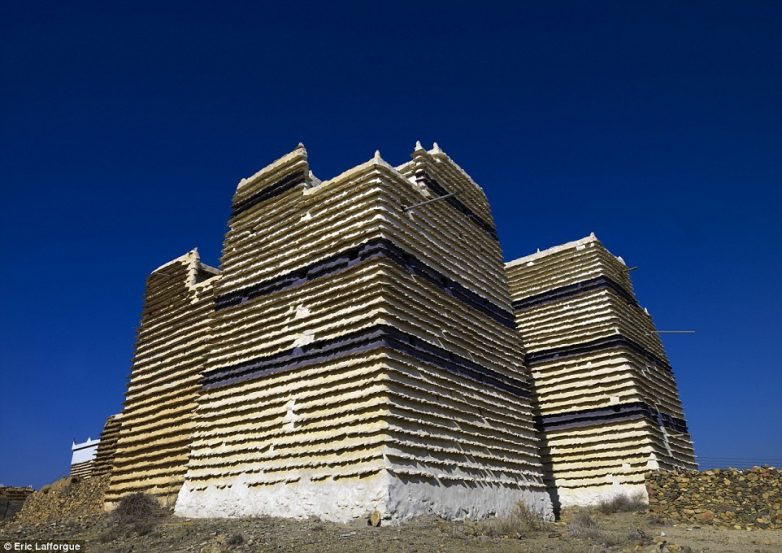 Так выглядят традиционные жилища из саманного кирпича в Наджране. Дома имеют несколько этажей. Нижний уровень отводится для домашнего скота, а этажом выше живут люди. Оконные проёмы имеют маленькие размеры, чтобы в дом не смогли проникнуть грабители. Чем выше этаж, тем больше окна. Возраст некоторых таких домов насчитывает несколько сотен лет.