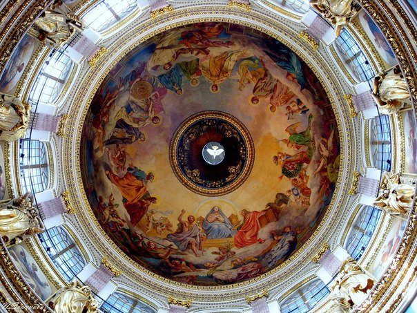 Исаакиевский собор сверху донизу украшен настенными росписями, мозаикой, скульптурами, мраморной отделкой. Если встать прямо под куполом и поднять глаза наверх, то можно увидеть одну из работ Карла Брюллова — плафон, изображающий молящуюся Богородицу. По правую руку от Богородицы находится Иоанн Креститель, а по леву – Иоанн Богослов. Дальше по кругу идут небесные покровители Дома Романовых. В самом центре плафона изображен белый голубь, символизирующий Святой Дух. Многими искусствоведами данный сюжет трактуется как обожествление власти Романовых. Также известно, что данную роспись К.Брюллов выполнял 4 года.