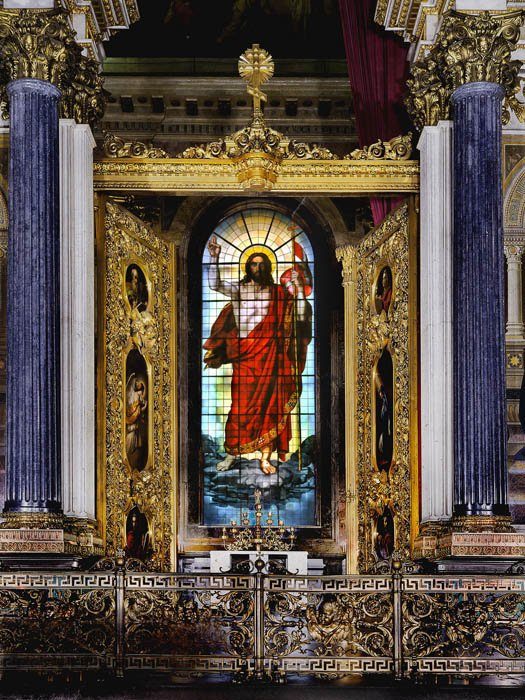 Пожалуй, самым странным кажется наличие витража в восточной части Храма. Идея поместить витраж, изображающий Воскресшего Христа, принадлежала немецкому архитектору Лео фон Кленце. Создавался витраж в Мюнхене по эскизу немецкого художника Генриха Мария фон Гесса. В 1843 году был установлен в Исаакиевском Соборе. Дело в том, что витражное искусство было свойственно католической церкви и готическому стилю, но никак не православным храмам. Считается, что такое необычное сочетание западного и восточного мира, то есть католичества и православия, следовало ожидать именно в эпоху расцвета романтизма в России.