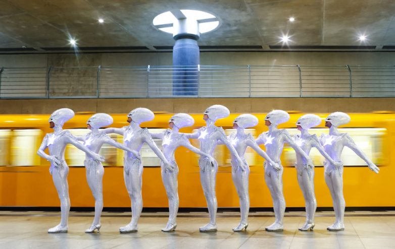 Танцоры театра-варьете «Фридрихштадтпаласт», задействованные в шоу «THE WYLD», на станции метро в Берлине, 23 июня 2015 года.