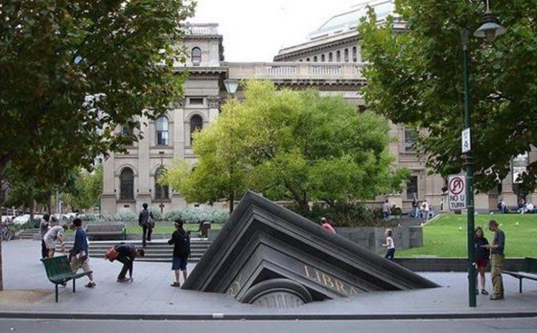 За пределами Государственной библиотеки Виктории существует множество «тонущих» статуй, однако «тонущее здание» в Мельбурне можно смело назвать лучшей из них!