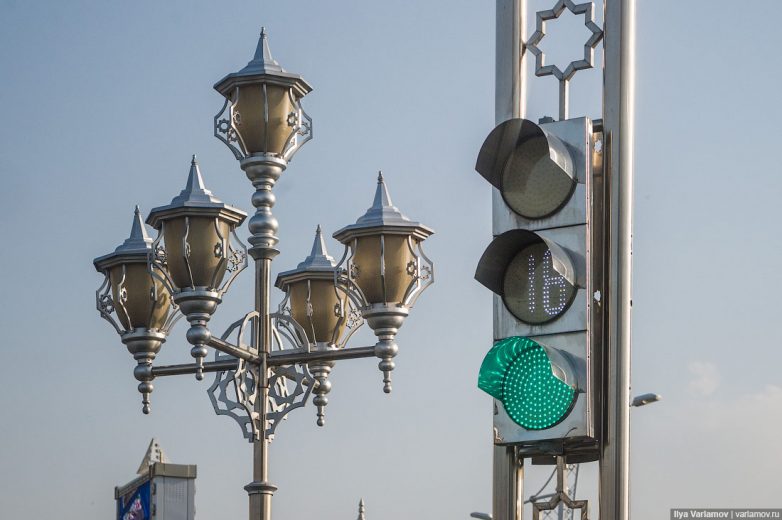 Еще Ашхабад может гордиться самыми необычными фонарными столбами. Во-первых, они разные на каждой улице, во-вторых, нигде в мире нет таких сложных фонарей. Каждый столб – это произведение искусства.