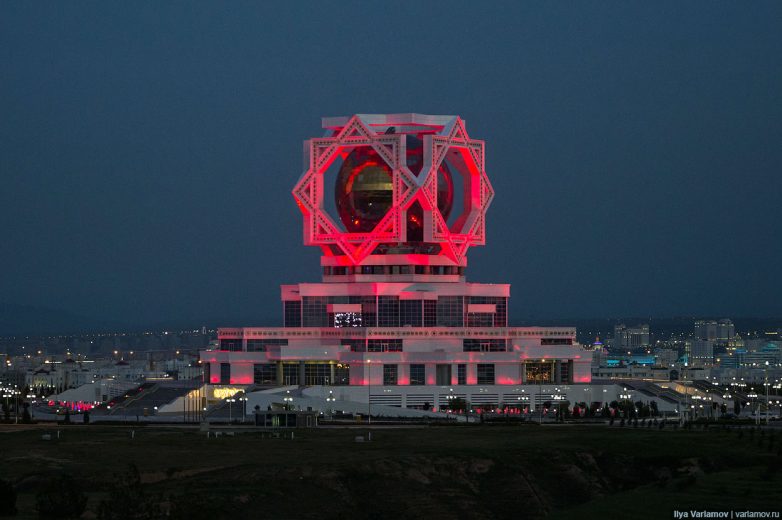 А это центральный ЗАГС Туркменистана. Здесь тоже глобус и гигантский восьмиугольник, или звезда Огузхана. Вообще, звездой Огузхана в Туркменистане украшают всё, что только можно. Присмотритесь к любому зданию, она повсюду.