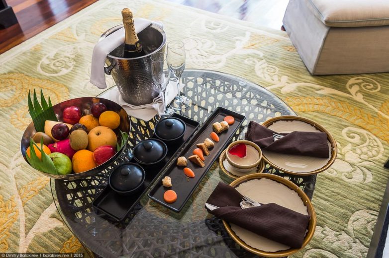 Внутри нас ждал подарочный ланч в честь заселения. Фруктовая корзина, орехи, восточные сладости (арабы — такие арабы) и бутылка шампанского Moët & Chandon за 4 тысячи рублей. Хорошее гостеприимство!