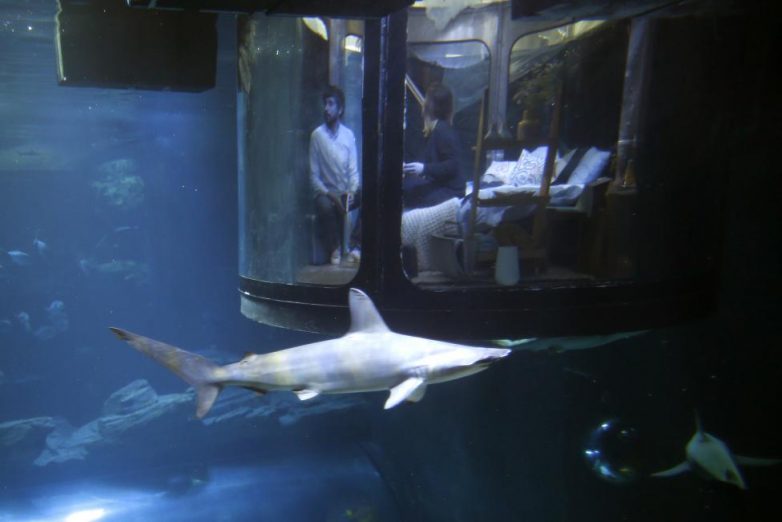 Комната находится на глубине 10 метров среди огромного аквариума с акулами. Ее стены сделаны из надежного стекла.
