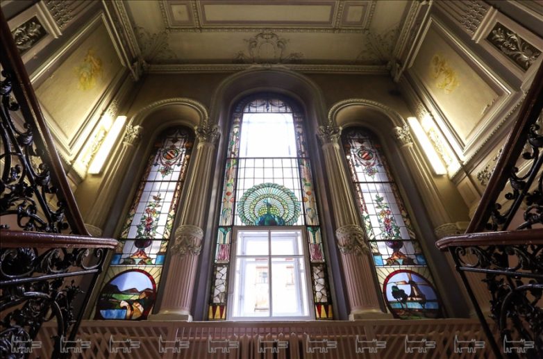 Лестница украшена массивной лепниной, резной балюстрадой и оранжевыми витражами. Исключительная по оригинальности спиральная лестница, опоясывая круглую шахту лифта, объединяет площадки центрального и дворового корпусов.