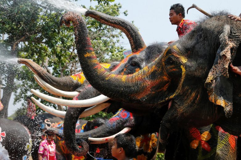 В некоторых городах, например в древней столице Аюттхаи, которая находится в 80 километрах от от Бангкока, в праздниках участвуют слоны. Их наряжают, раскрашивают в яркие цвета. Аюттхая, Таиланд, 11 апреля 2016.