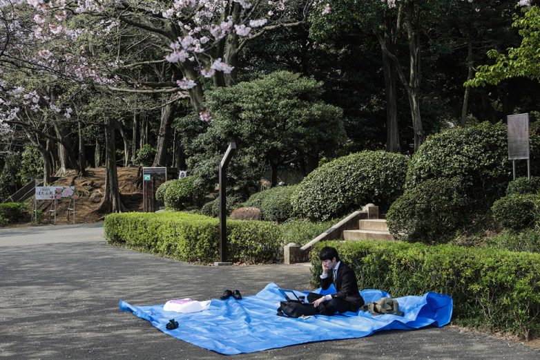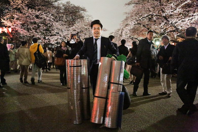 В парке Уэно специально обученные люди разносят специальные коврики для удобного любования сакурой.