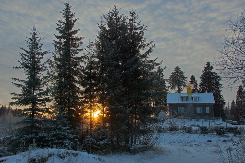 За поселком Рауталахти есть неприметная табличка «Налево Харлу 6». В предыдущие поездки мой путь лежал только прямо, но в этот раз поворот налево уже был запланирован. Немного тряски на убитом асфальте и я уже вкатываюсь в задымленный Харлу — мерзнуть из местных жителей не хотел никто, поэтому дым валил почти из каждой трубы.