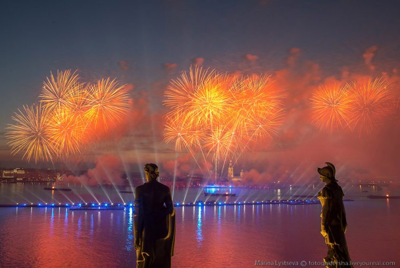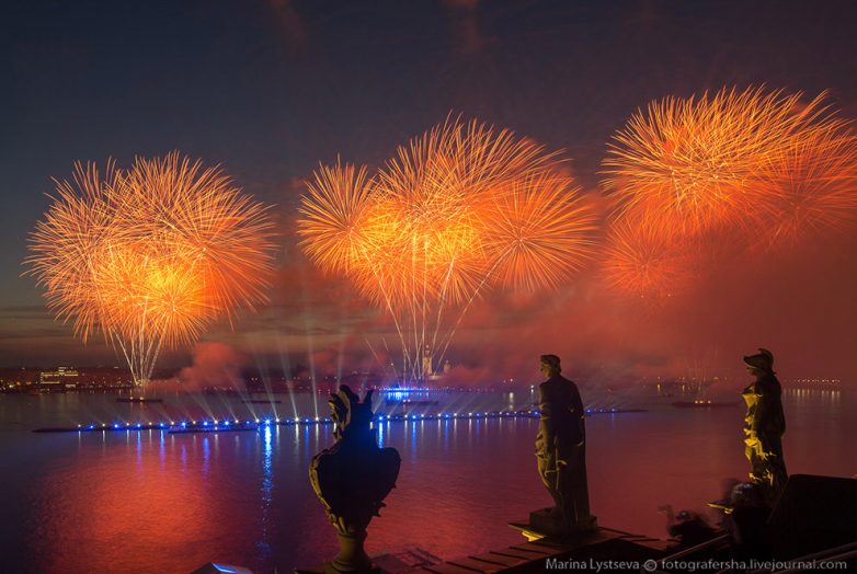 Жители Петербурга и гости города сегодня ночью смогли увидеть свето-пиротехническое шоу в радиусе четырёх километров. В небо над Невой было выпущено порядка 50 тысяч зарядов, а в акватории напротив Эрмитажа разместились 435 метров понтонов, а под Троицким мостом 120 метров понтонов и четыре 32-метровых башни на мосту.